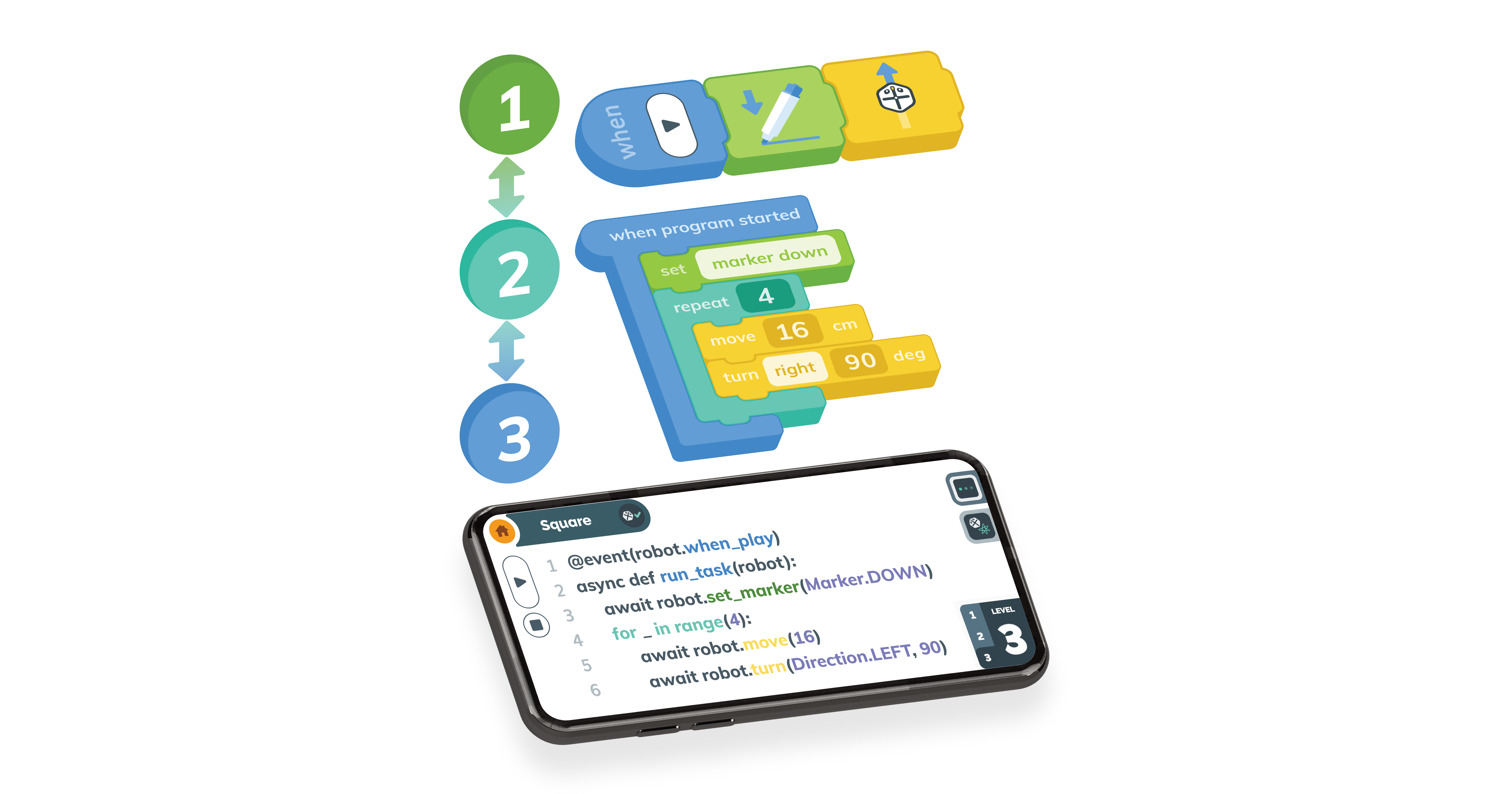 Featuring 3 learning levels in a visual block-based coding environment, the iRobot Coding Apps' ability to convert projects across each level supports student progression graphical, to hybrid, then full-text blocks in Python. Designed to help increase accessibility to STEM education, the Apps are multi-platform compatible and feature a simulator environment with interactive 3D Root SimBots!